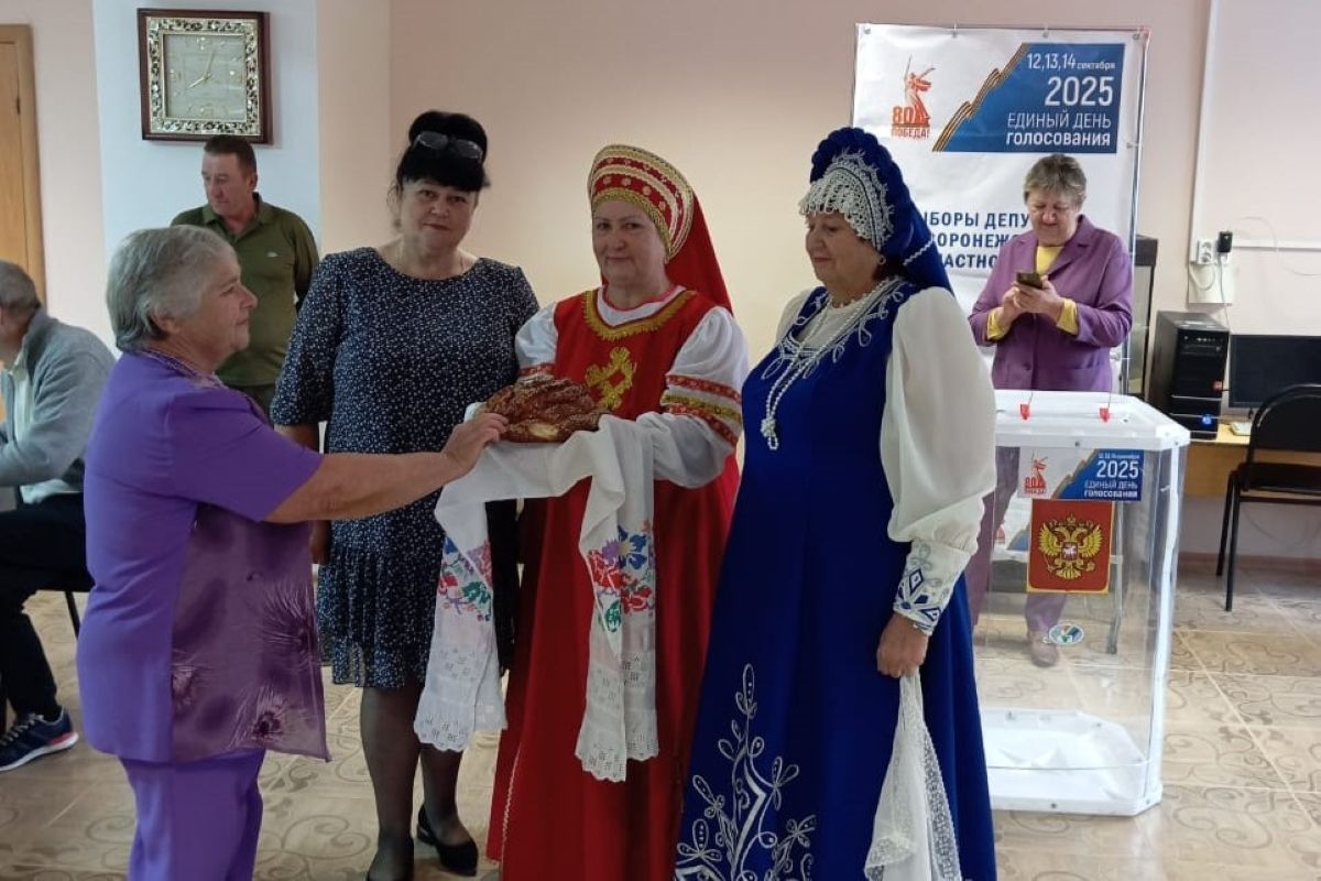 В Эртильском районе жителей, пришедших первыми на избирательные участки, встречали члены УИК в русских народных костюмах и с короваем.